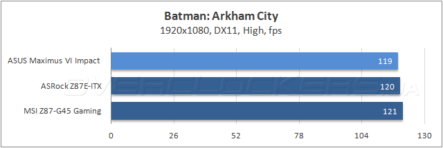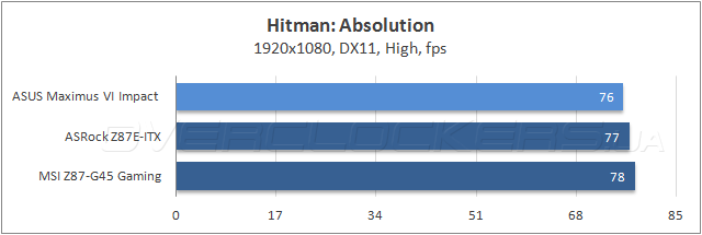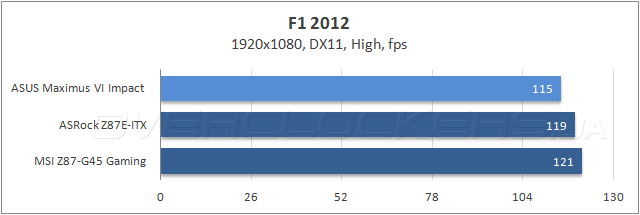 А вот в реальных игровых приложениях ситуация не столь однозначная. В шутерах Batman: Arkham City и Hitman: Absolution разница новинки с конкурентами почти не заметна, но в гоночном симуляторе F1 2012 отставание достигло 5%, так что программистам из ASUS стоит поработать над оптимизацией управляющего микрокода Maximus VI Impact.