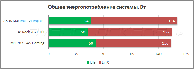 При отсутствии нагрузке новинка продемонстрировала средний уровень энергоэффективности, но после запуска стресс-теста LinX Maximus VI Impact оказалась самой прожорливой. Сложно сказать, что послужило причиной такого явления, скорее всего, в текущей версии прошивки работа энергосберегающих технологий далека от идеала.
