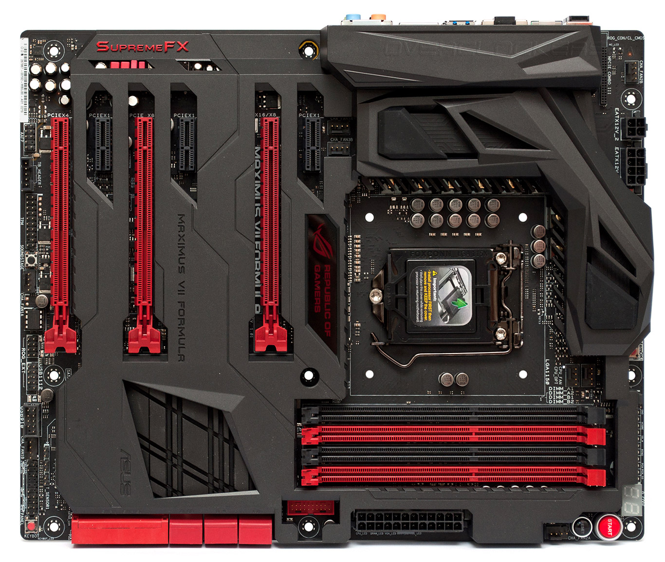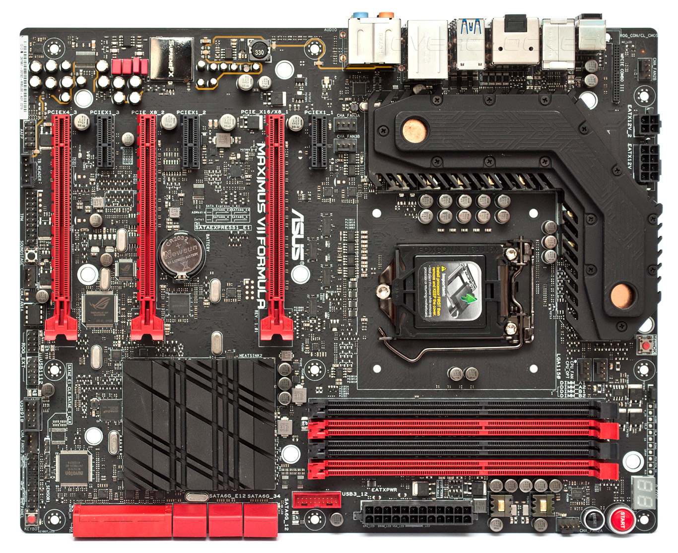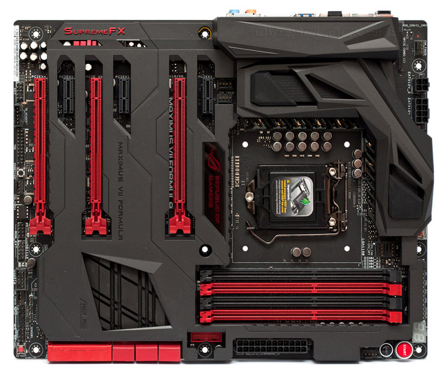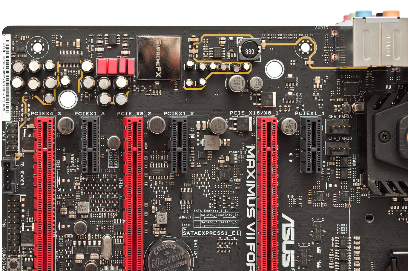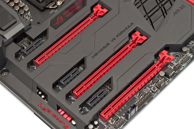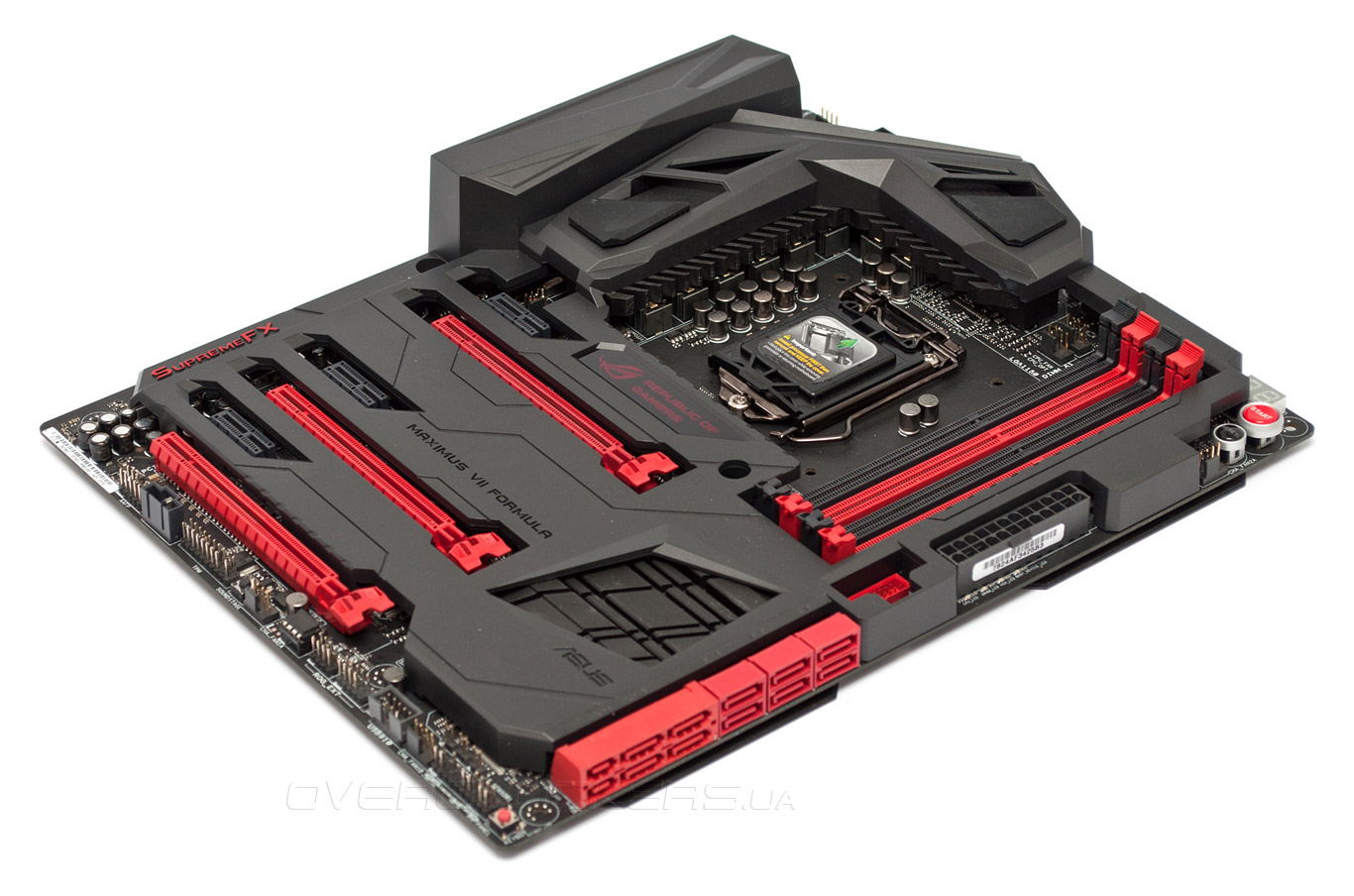 Благодаря использованию системной логики Intel Z97 материнская плата поддерживает полный набор инструментов по разгону процессоров Intel Haswell. ASUS Maximus VII Formula оснащена четырьмя разъемами DIMM для установки модулей ОЗУ стандарта DDR3. Тактовая частота оперативной памяти в режиме разгона может достигать 3300 МГц, а ее максимальный объем органичен 32 ГБ. Для организации графической подсистемы служат два порта PCI Express 3.0 x16, которые могут работать в режимах «х16+х0» или «х8+х8», что позволяет строить конфигурации AMD CorssFireX и NVIDIA SLI. Третий по счету разъем PCI Express x16 подключен к чипсету, он работает в режиме x16@x4, но также может быть использован для установки видеоускорителя. С целью расширения функциональности системной платы пользователи могут инсталлировать карты расширения, для этих целей служат три разъема PCI Express 2.0 x1, а также слот mini-PCIe 2.0 x1, распложенный на дочерней плате mPCIe Combo III. Для обеспечения одновременной работы слотов PCI-E и дополнительных контроллеров служит чип ASMeida ASM1187e, играющий роль восьмипортового коммутатора линий PCI Express 2.0.