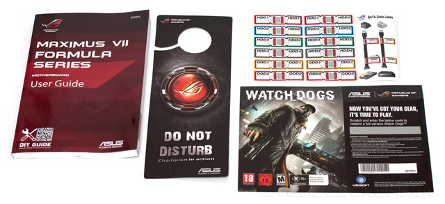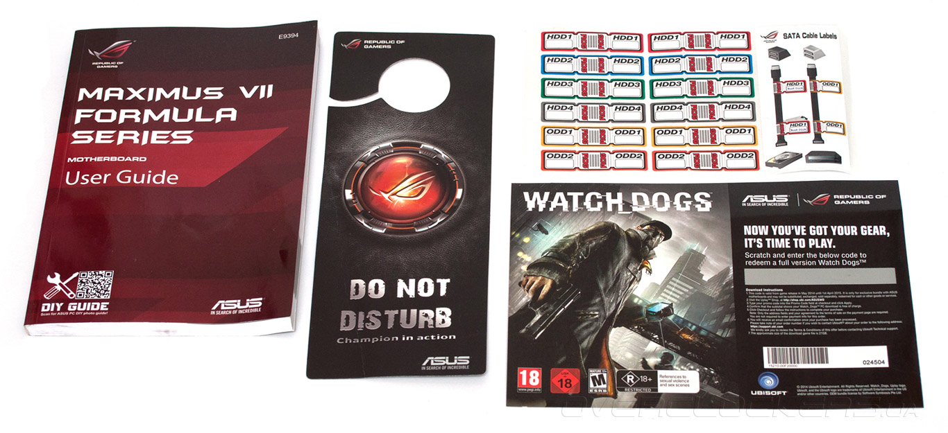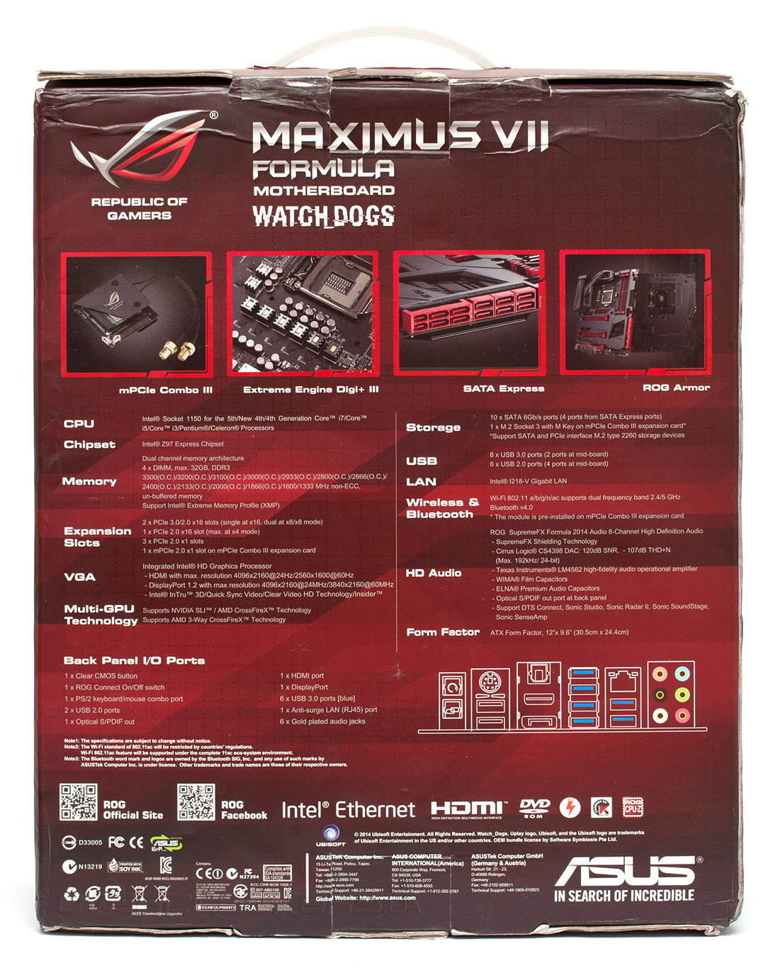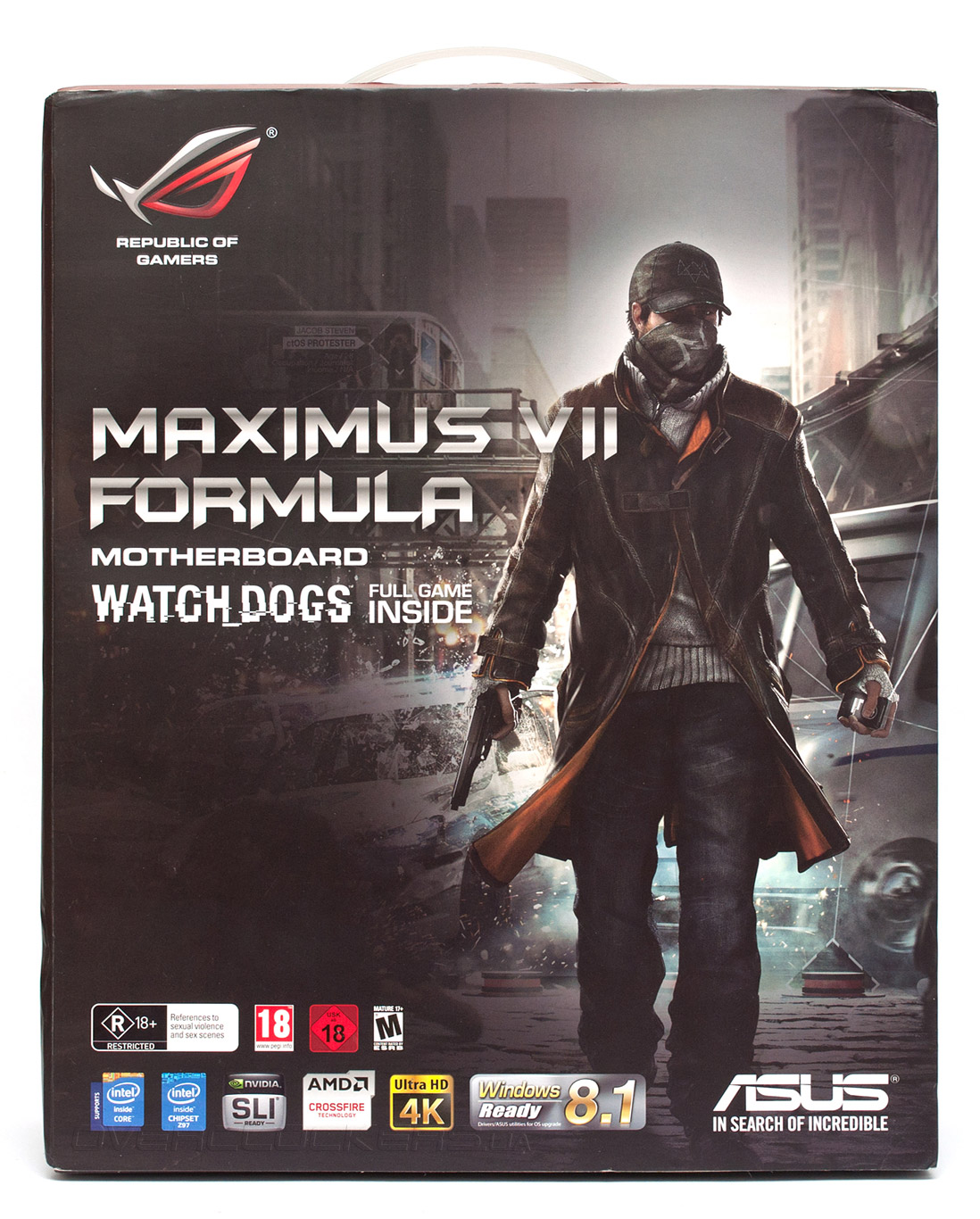 Крупная картонная коробка, в которой поставляется материнская плата Maximus VII Formula, снабжена удобной ручкой для переноски. В дизайне упаковки не сразу угадывается принадлежность продукта к семейству ASUS Republic of Gamers, так как лицевую сторону коробки украшает постер игры Watch Dogs — популярного экшена разработки студии Ubisoft Montreal.