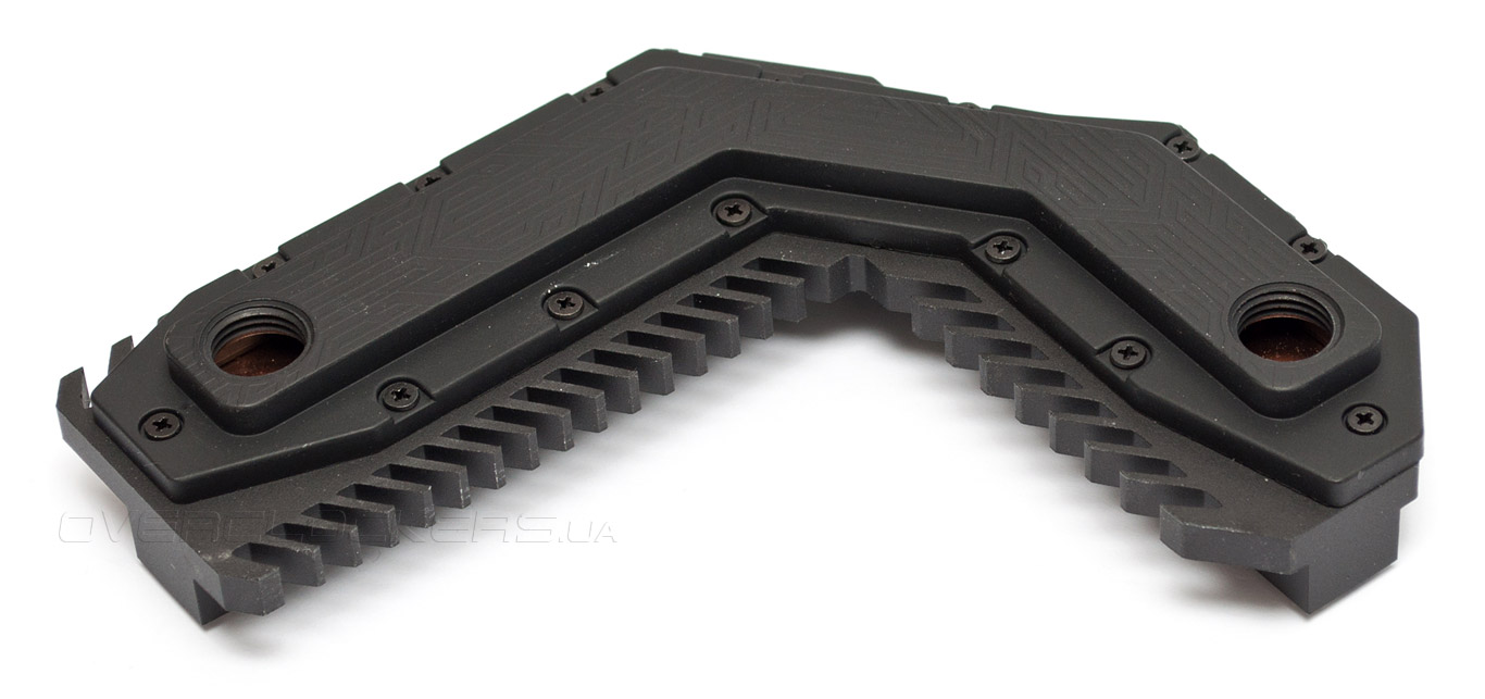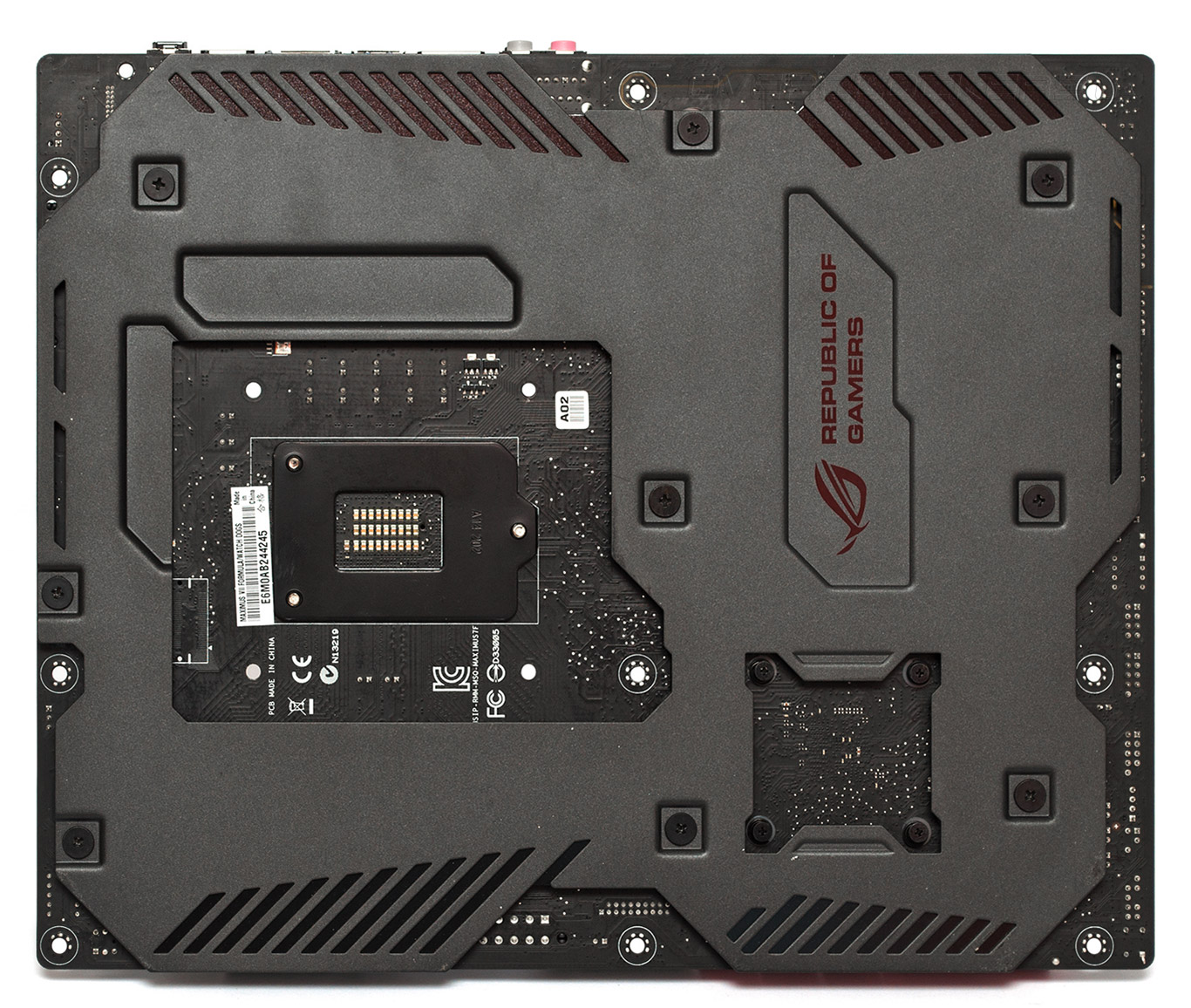 Кожух, накрывающий лицевую поверхность печатной платы, выполнен их прочного пластика, тогда как нижняя половинка — металлическая. Судя по наличию выштамповок в районе процессорного разъема она также выполняет функцию отвода тепла от силовых элементов VRM.