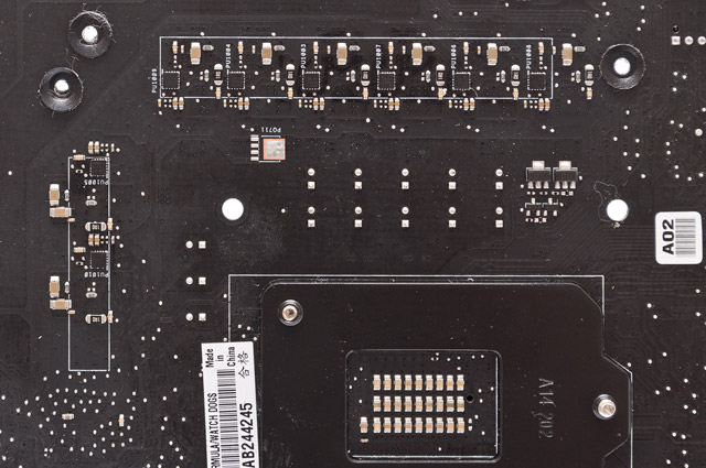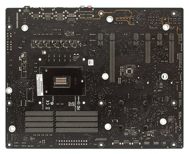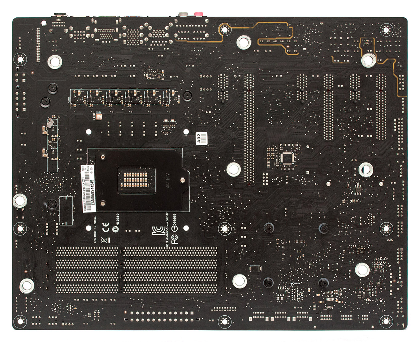 С обратной стороны РСВ распложено некоторое количество электронных компонентов, однако, в районе процессорного разъема нет ничего, что могло бы помешать установке кулеров, оснащенных крупными усилительными пластинами.