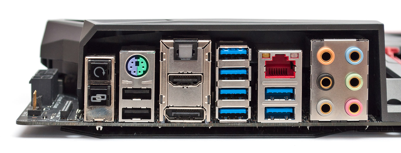 Для подключения периферии ASUS Maximus VII Formula оснащена восемью разъемами USB 3.0, шесть из которых реализованы на базе системной логики, а два оставшихся подключены к микросхеме ASMedia ASM1042, причем, четыре из шести чипсетных каналов выведены на заднюю панель. Кроме того, новинка оснащена шестью интерфейсами USB 2.0 и разъемом ROG_EXT для подключения внешней панели управления OC Panel, а также сетевым интерфейсом Gigabit Ethernet, реализованным на базе контроллера Intel I218V. В итоге, на задней панели системной плата расположились: