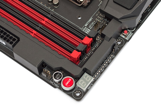 Для удобства эксплуатации в условиях открытого стенда системная плата оснащена кнопками включения и перегрузки, линейкой диагностических светодиодов Q-Led, сигнализирующих об инициализации отдельных подсистем, индикатором кодов POST и контрольными точками для измерения напряжения. Также, в правом верхнем углу находится клавиша MemOK!, которая активирует одноименную функцию, что позволяет загрузить UEFI Setup даже в случае установки неработоспособных параметров ОЗУ.