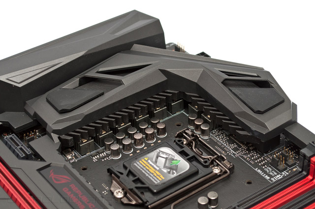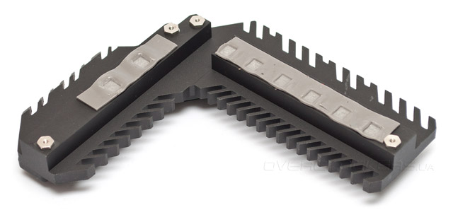Радиатор силовой подсистемы совмещен с водоблоком, рассчитанным для подключения фитингов G1/4″, но, благодаря развитому оребрению, даже в режиме воздушного охлаждения его эффективности вполне достаточно для разгона процессоров Intel Haswell «на воздухе».