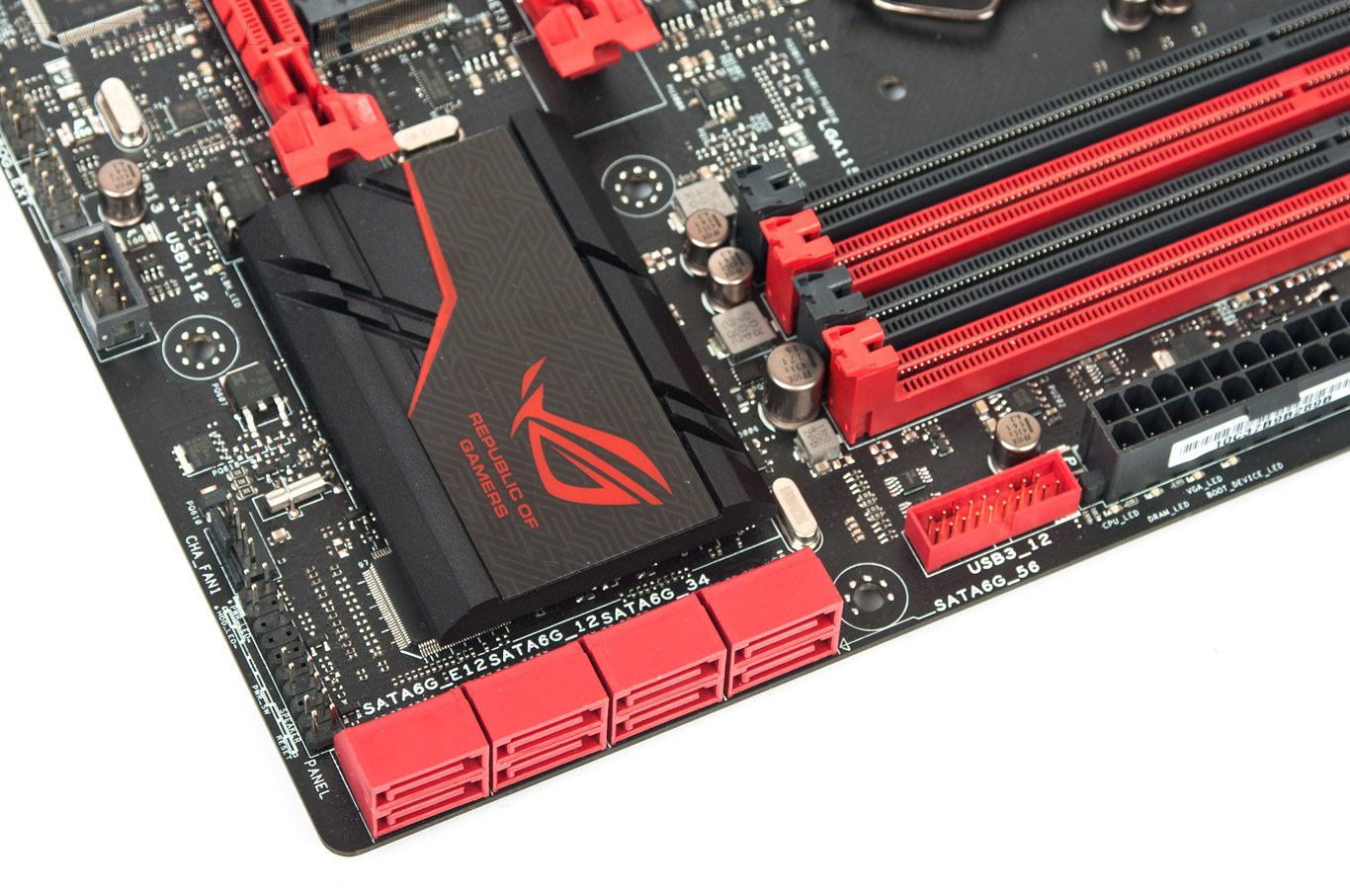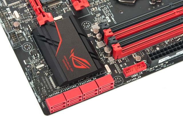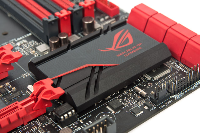 Средних размеров охладитель чипсета оказался не таким простым, как может показаться: отверстие, прикрываемое пластиковой накладкой с изображением эмблемы ROG, открывает доступ к трём красным светодиодам, размещённым на PCB. В режиме простоя они маняще мигают, а в процессе работы подсвечивают логотип. Иллюминация может быть отключена в UEFI, правда, при этом сами элементы всё равно остаются в рабочем состоянии, но светятся едва уловимо. Оттого теплоёмкость такого решения не самая выдающаяся, но наша лаборатория сталкивалась с куда более простыми конструкциями, успешно справлявшихся с поставленной задачей.