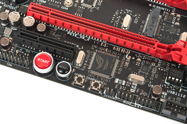 У нижней грани размещены все наиболее любопытные органы по управлению системой. Кнопка включения обладает подсветкой белого цвета с многократно усиливающейся интенсивностью свечения в момент работы системы, а Reset при этом подсвечивается красным. Рядом распаяны две новинки — KeyBot и SoundStage. Первая умеет аппаратным способом активировать поддержку макросов, которые составляются при помощи фирменного ПО. Для инициализации рабочего состояния рядом находится небольшой красный светодиод. Другая кнопка позволяет «на лету» менять профили звучания системы, заготовленные на странице Sonic SoundStage в программной среде конфигуратора звукового устройства. Честно говоря, достаточно сложно себе представить картину использования обеих, особенно в режиме работающего ПК. Профилей всего пять (четыре особенных и режим по умолчанию), а навигацию между ними отображает POST-индикатор. Здесь же можно подключить выносную термопару (в комплекте поставки её нет), и последний элемент — контактная группа для подсоединения ROG Front Base или OC Panel, их тоже придётся найти самостоятельно.