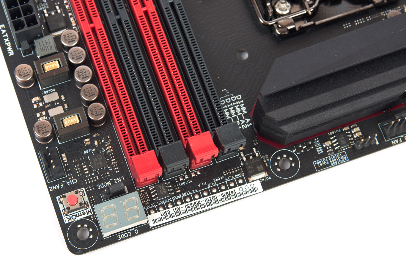 Верхняя грань примечательна традиционной кнопкой MemOK!, собственно индикатором POST-кодов, а главное — группой точек, где можно замерить действующие напряжения, число которых исчерпывающее. Правда, исполнение вынуждает привлекать в помощь паяльник — для закрепления необходимого числа проводков, которых также в комплекте нет. Непосредственная работа со щупами затруднена из-за близкого расположения самих площадок и обширного числа припоя, нанесённого на них, ввиду чего щупы постоянно норовят соскочить с шарообразной поверхности. Не обошлось и без перемычки, которая позволит разблокировать режим работы с экстремальным типом охлаждения, когда активизируются методы по корректной отработке ситуации Cold Bug и другие средства, стабилизирующие работу системы.