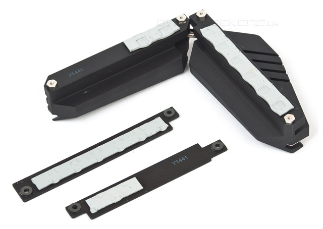 Эта конструкция имеет очень солидный вес, а значит и теплоёмкость. Температура между отдельными секциями уравнивается при помощи тепловой трубки. Передача тепла к ним обеспечена при помощи традиционных прокладок толщиной около полутора миллиметров.