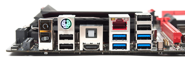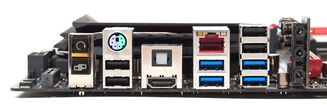Задняя панель немного необычна, особенно без установленного на борт звукового адаптера. Для комплекса KeyBot следует использовать USB-версию клавиатуры, при этом подключать её нужно лишь к оговоренному гнезду. Непривычно мало видеопортов, но выбор произведён в пользу наиболее универсального HDMI, дополненного конвертером уровней сигналов ASM1442. Любопытно, что два из четырёх гнёзд USB 3.0 реализованы посредством контроллера ASM1042.