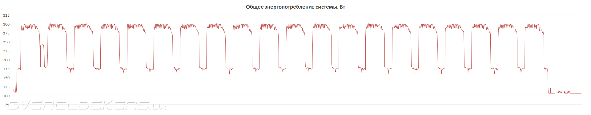 Замеры выполнялись после прохождения всех прочих тестов в «устоявшемся» режиме компьютера при помощи прибора собственной разработки. Методика заключалась в фиксации средневзвешенного значения потребления тестового стенда «от розетки» во время прохождения теста Prime95 с применением профиля In-place large FFTs а также при простое компьютера после завершения теста.