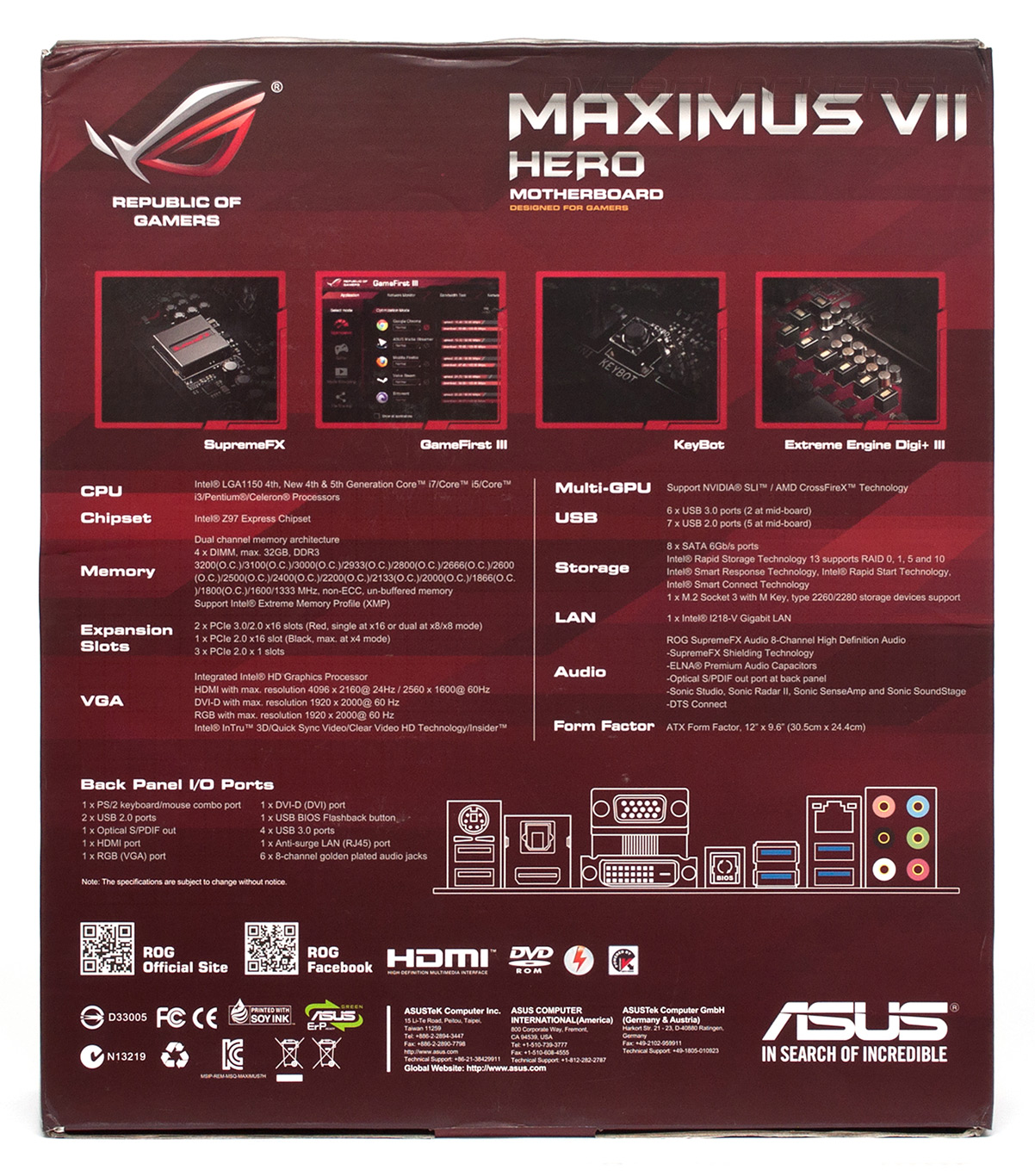Материнская плата продается в довольно крупной вертикальной коробке, оформление которой безошибочно указывает на принадлежность ASUS Maximus VII Hero к семейству Republic of Gamers. На лицевой стороне помимо наименования модели и логотипа серии ROG нанесены значки, определяющие совместимость устройства с новейшей ОС Microsoft Windows 8.1, поддержку конфигураций AMD CrossFireX и NVIDIA SLI, а также вывод изображения со встроенной видеокарты в разрешении 4К.