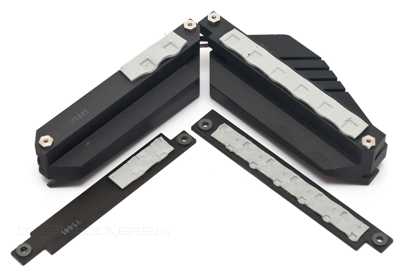 В качестве термоинтерфейса используются толстые прокладки из резиноподобного материала, а сама конструкция имеет надежное винтовое крепление. С обратной стороны радиаторы фиксируются парой металлических пластин, предотвращающих деформацию текстолита и улучшающих температурный режим.
