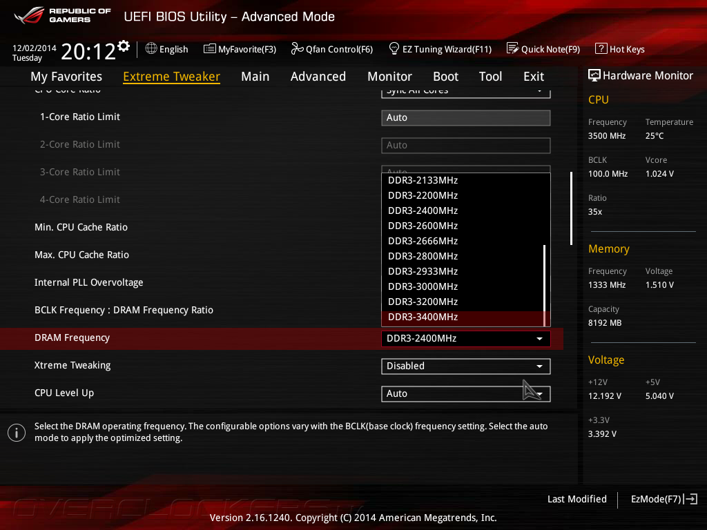 Несмотря на то, что режим EZ Mode позволяет выполнить только базовую конфигурацию материнской платы, и даже немного поднять быстродействия, для полного контроля над всеми параметрами и, тем более, полноценного разгона следует воспользоваться продвинутым режимом. На вкладке Extreme Tweaker сосредоточено большинство настроек, отвечающих за оверклокинг, среди которых присутствует регулировка базовой частоты и настройки параметра CPU Strap, отвечающего за повышение BCLK, управление множителями вычислительных ядер и кэша L3, а также опцией Xtreme Tweaking, включение которой повышает быстродействие в старых бенчмарках, и функции ASUS MultiCore Enhancement, оптимизирующей производительность в приложениях, не предназначенных для выполнения на многоядерных процессорах.