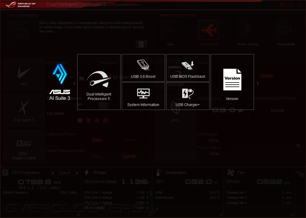 Как и все другие представители игровой серии ASUS героиня сегодняшнего обзора снабжена DVD-диском. На нем помимо всех необходимых драйверов записан щедрый набор разнообразного ПО, среди которого присутствует комплексная утилита Ai Suite 3, состоящая из отдельных подпрограмм, которые отвечают за разгон, системный мониторинг и реализацию дополнительных функций.