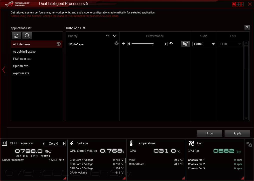 Подпрограмма Dual Intelligent Processor 5 выполняет функции управления быстродействием, настроек режима работы вентиляторов и вывода показаний аппаратных сенсоров. В главном окне отображаются статусы работы отдельных функциональных модулей, а в нижней части интерфейса находится информационная панель, на которую выводятся данные с датчиков системного мониторинга. Кликнув по группе датчиков можно увидеть динамику изменения показаний, кроме того, есть возможность настроить срабатывание защиты по достижению предельных значений.