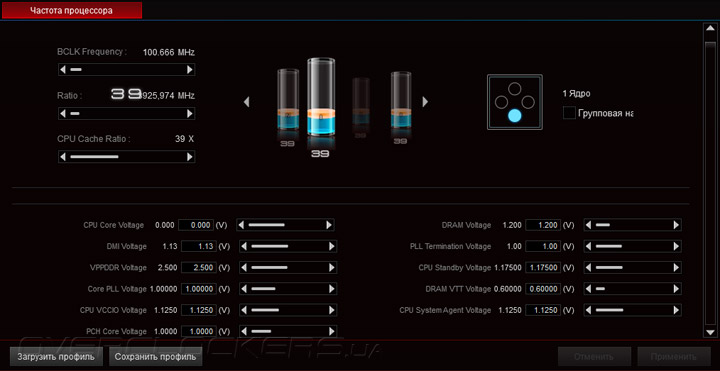 Имеем серьёзный инструментарий, подходящий не только для проведения разгона, а скорее созданный для экспериментов с различными второстепенными настройками, что более всего востребовано в сессиях бенчмаркинга и покорения различных вершин и рекордов.