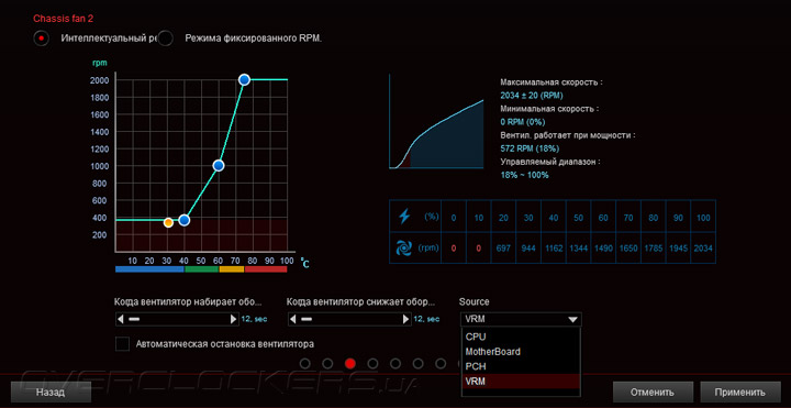 Страница Monitor, как и предыдущие, имеет обширное число пунктов. Здесь видны показания с четырёх температурных датчиков, среди которых есть VRM, отображающий текущую температуру стабилизатора питания. Пустуют три T_Sensor, гнёзда для них находятся на самой плате, а также заготовлено место под ещё три EXT_Sensor. Данные в этом случае будут собираться с дополнительной выносной платы Fan Extension Card, где также предусмотрено три гнезда для термопар. Такие же три пункта меню заготовлены и для трёх вентиляторов, они именуются Extension Fan. Семь колодок для подключения охладителей есть на PCB — со всех них информация поступает и обрабатывается платой.