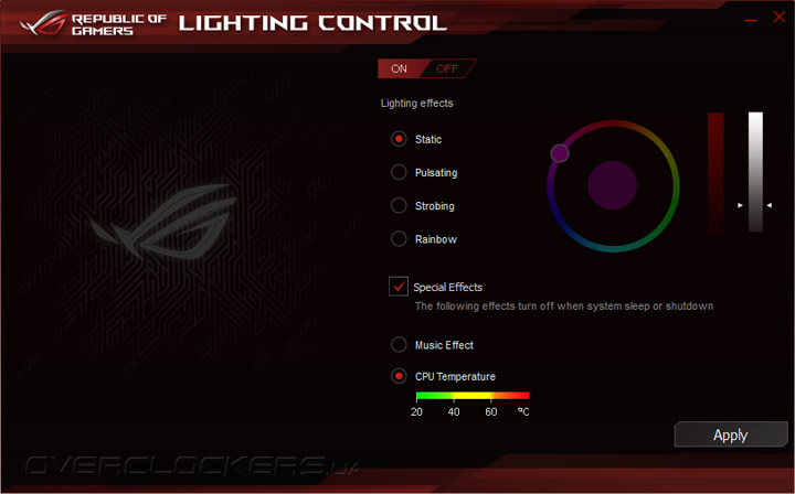 Остальные программы понравятся больше тем, кто интересуется мультимедийной оснасткой. Lighting Control позволяет настроить схему работы иллюминации эмблемы, расположенной на охладителе PCH. Есть четыре обычных сценария, последний из них — перебор всех цветов. Ещё два динамических профиля опираются на музыкальное сопровождение либо же температуру ЦП. Всё выглядит захватывающе, и работает без всяких проблем.