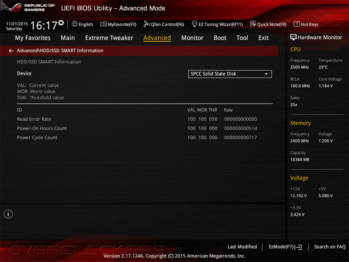 Насыщенным вышел раздел Tool. Хорошо знакомы утилиты по разного рода продуктам производителя: EZ Flash (обновление прошивки), Overclocking Profile (сохранение текущих настроек системы в один из восьми слотов, либо на внешний носитель) и SPD Information (получение данных о возможностях комплекта ОЗУ). Менее распространёнными являются Secure Erase (очистка SSD без ущерба для его ресурса) и Graphics Card Information (получение сведений об установленных видеокартах). BIOS FlashBack и ROG OC Panel H-Key Configure — особые пункты. Первый открывает доступ к механизму прошивки, обозначенному в самом начале раздела, ещё здесь можно форсировать загрузку с другой микросхемы и понять, где находишься, в случае отсутствия визуального контакта с самой платой. Второй пункт предполагает внесение корректировок в настройки выносного блока управления OC Panel.