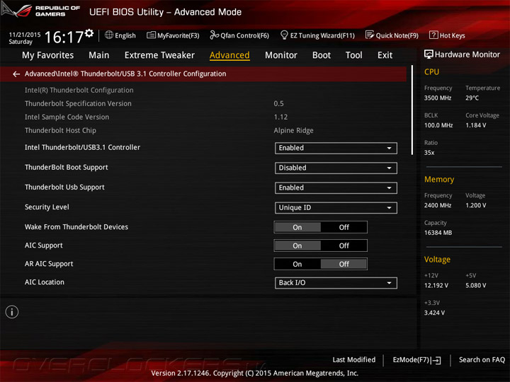 Пункт меню UEFI Advanced собрал настройки прочих компонентов системы. Здесь можно отказаться от части подсветки, управлять работой портов USB разных поколений, включать или отключать дополнительные контроллеры, распаянные на плате. Любопытно выглядит весьма глубокая проработка возможностей Intel Thunderbolt.