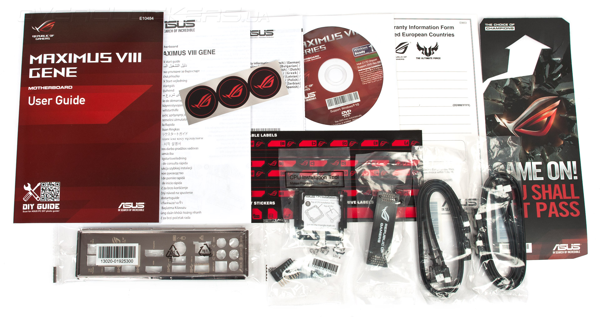 - комплект наклеек из трёх круглых логотипов ROG (для вентиляторов), двенадцати парных маркеров для кабелей, пары — для накопителей, четырёх — для клавиатуры;