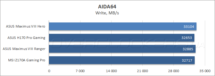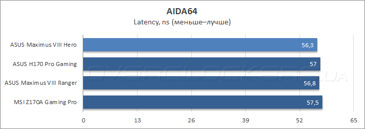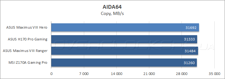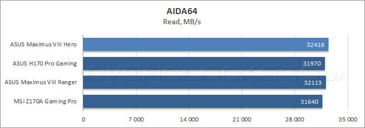 При оценивании пропускной способности ОЗУ в программе AIDA64 материнская плата Maximus VIII Hero заслужила максимальные оценки.
