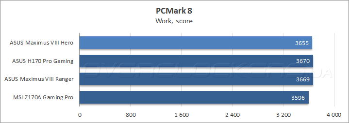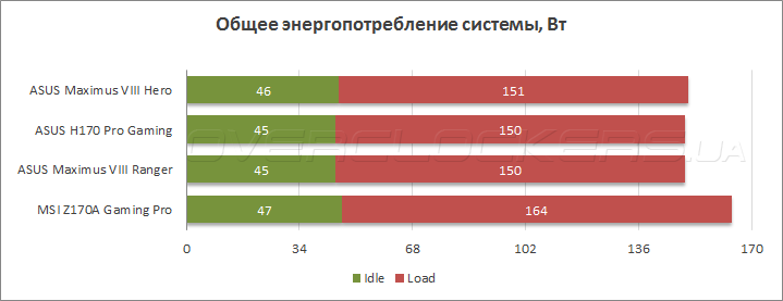 По уровню энергопотребления Maximus VIII Hero в точности повторила поведение двух других «материнок» ASUS, тогда как разницу в 1 Вт можно отнести к погрешности измерения.