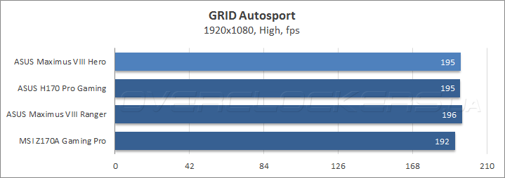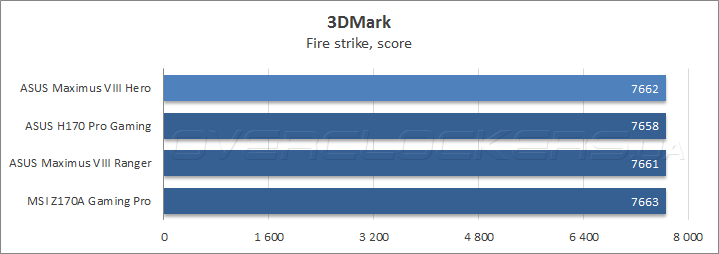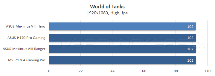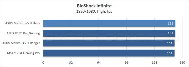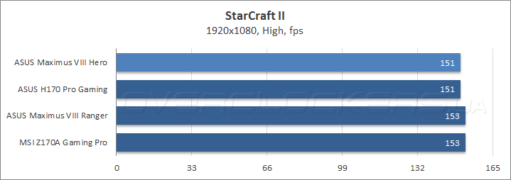 Измерение частоты смены кадров в современных видеоиграх проходило в экранном разрешении 1920х1080 и при высоких настройках изображения. В трех из четырех дисциплин ASUS Maximus VIII Hero обеспечила максимальное быстродействие, и лишь в RTS StarCraft II уступила пару кадров в секунду своей младшей сестре Maximus VIII Ranger и участнице от MSI, что, впрочем, совершенно не отразиться на комфортности игрового процесса.