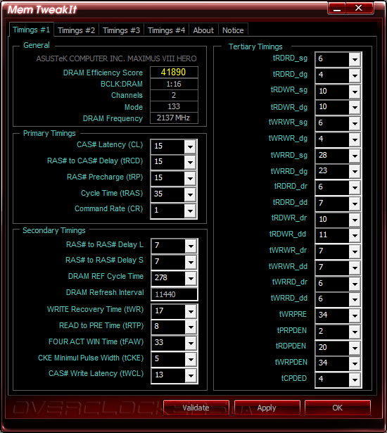 Вместе с Maximus VIII Hero поставляется программный продукт Mem TweakIt для управления таймингами подсистемы ОЗУ. Увы, приложение не справляется со своими обязанностями, но вместо регулировок его можно использоваться для получения подробной информации о режиме работы модулей оперативной памяти.