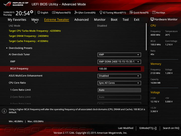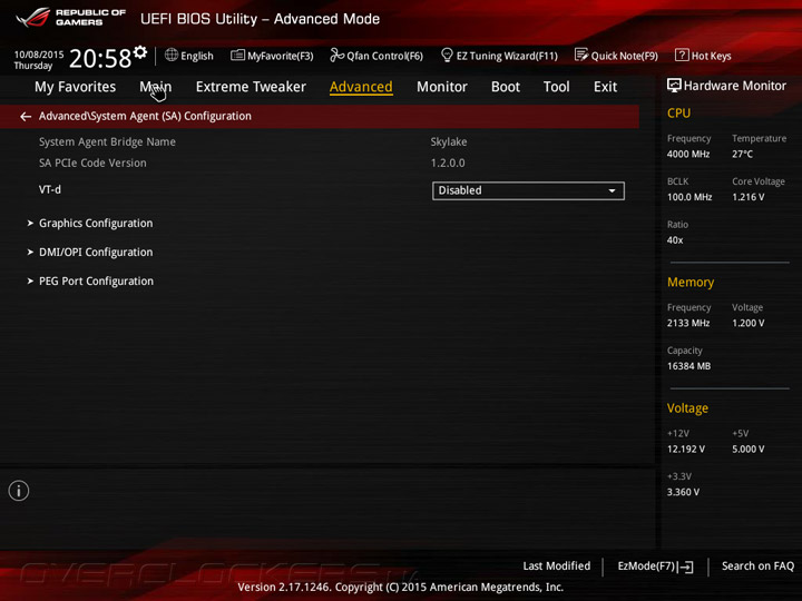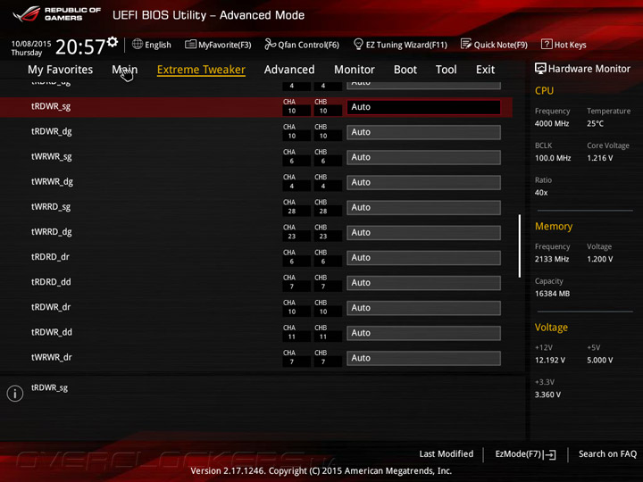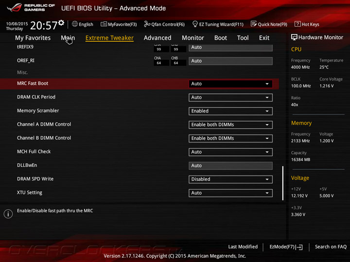 Что касается автоматического разгона, то выбор профиля Gamers Profile обеспечил прирост частоты CPU до 4500–4700 МГц в зависимости от характера нагрузки, но напряжения на центральном процессоре составило 1,456–1,472 В, что явно небезопасно для повседневной эксплуатации Skylake, к тому же в моменты простоя Vcore не снижалось вместе с частотой. Зато, для подсистемы ОЗУ был установлен профиль X.M.P. с частотой 2400 МГц с таймингами 15-15-15-35-2Т.