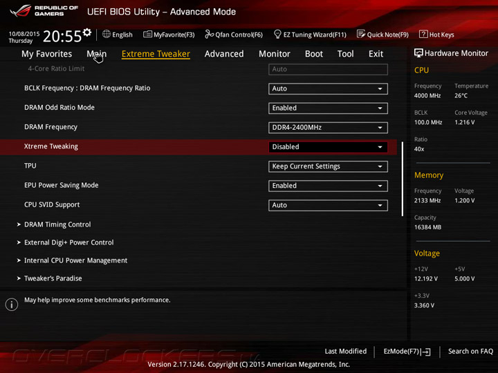 Раздел Extreme Tweaker, отвечающий за разгон, служит для активации профилей Х.М.Р. модулей ОЗУ, управления BCLK и коэффициентами умножения вычислительных ядер, установки тактовой частоты оперативной памяти, включения функции ASUS MultiCore Enhancement, которая повышает быстродействие в приложениях, не оптимизированных для многопоточного выполнения, и опции Xtreme Tweaking для увеличения результатов в старых бенчмарках. Здесь же активируется фирменная технология энергосбережения EPU.