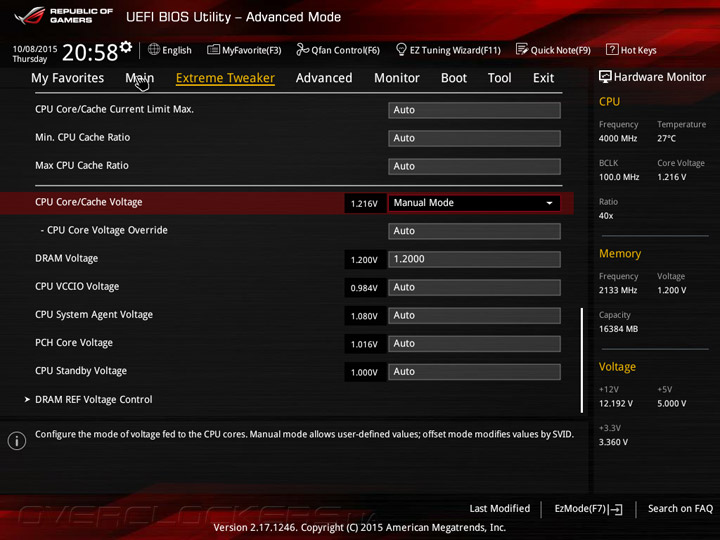 Помимо того, на вкладке Extreme Tweaker задается множитель кэша L3, а также напряжения на центральном процессоре и всех основных узлах материнской платы.