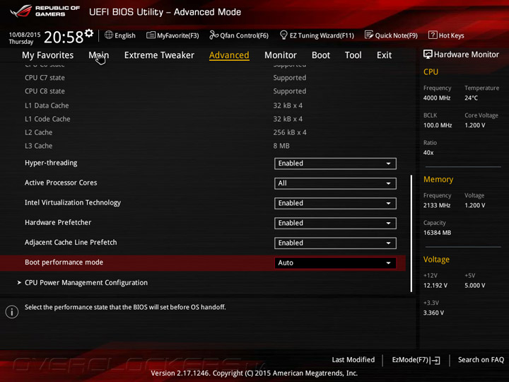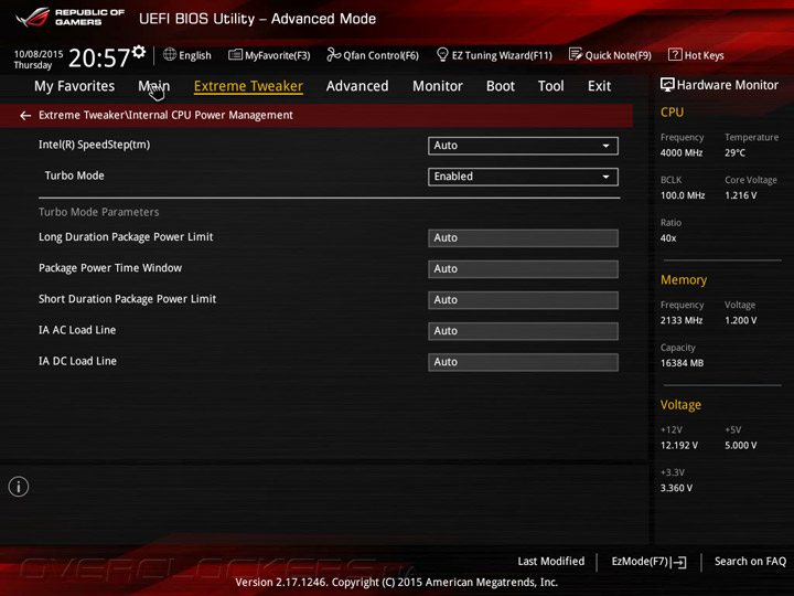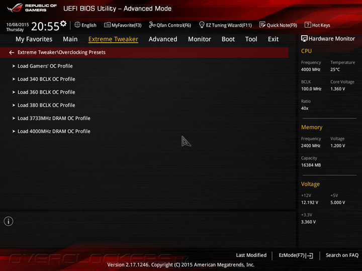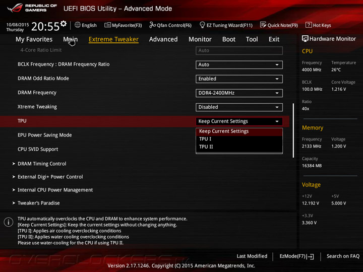 Прошивка ASUS Maximus VIII Hero располагает несколькими механизмами автоматического разгона, пользователи могут выбрать один из профилей повышенного быстродействия Overclocking Presets, или воспользоваться функций TPU, которая способна принимать одно из двух значений.