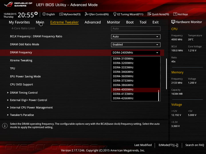Частота оперативной памяти может варьировать в широких пределах — до 4266 МГц включительно, а подбор необходимой величины облегчает два набора значений кратных 100 и 133 МГц.