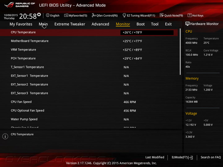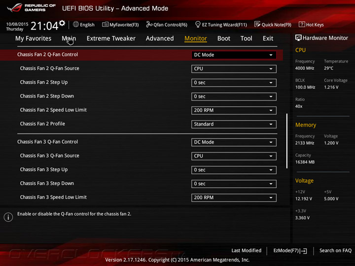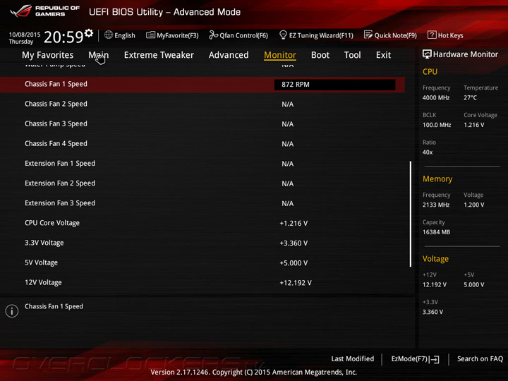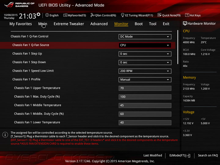 Аппаратный мониторинг и управление системой охлаждения находятся в разделе Monitor. Здесь выводятся показания четырёх встроенных и одной внешнего термопар, а также температуры с трех сенсоров, подключаемых к плате расширения Fan Extension Card, данные с десяти тахометрических датчиков и значения пяти напряжений.
