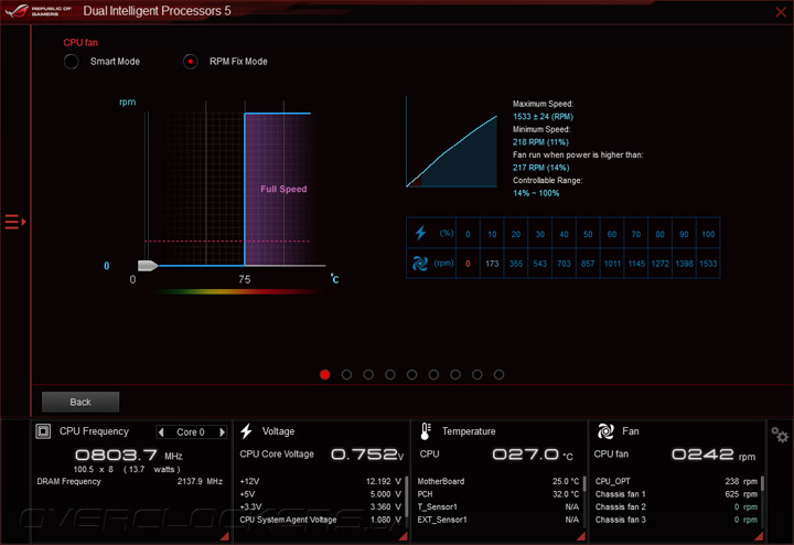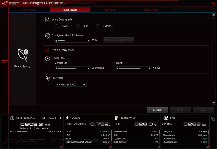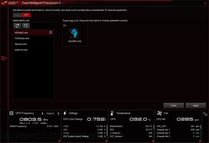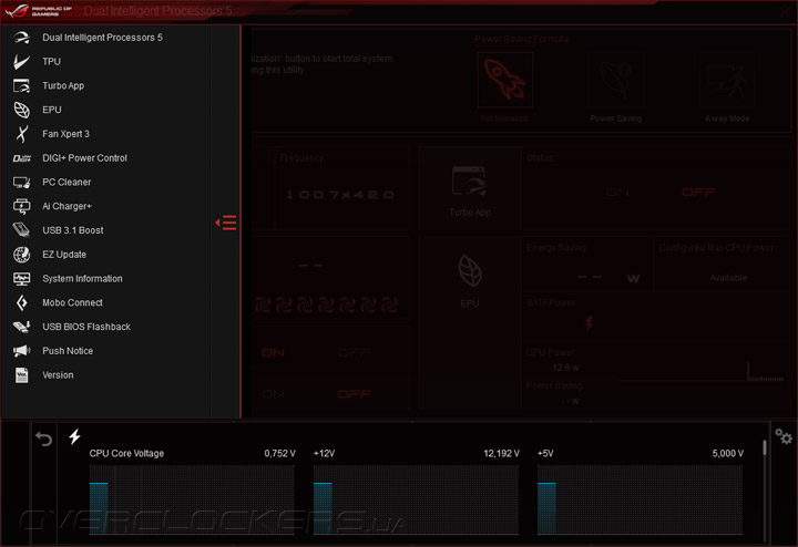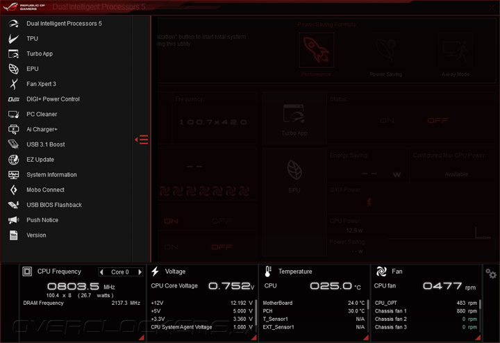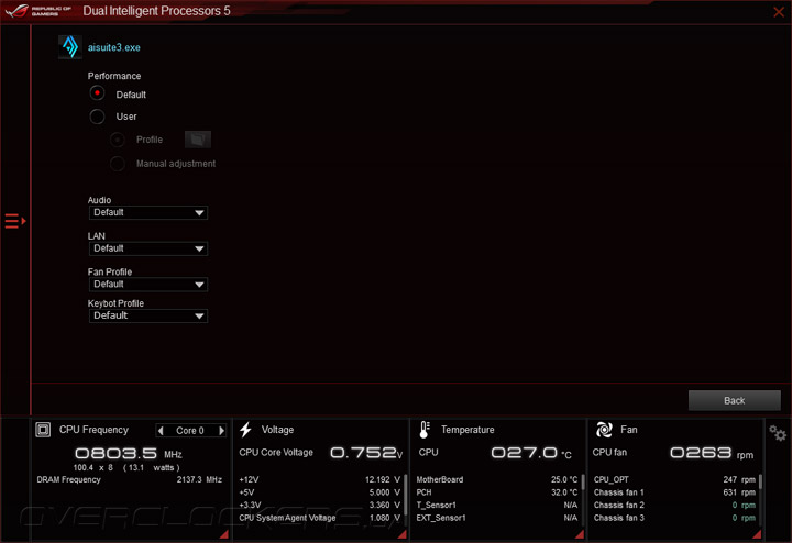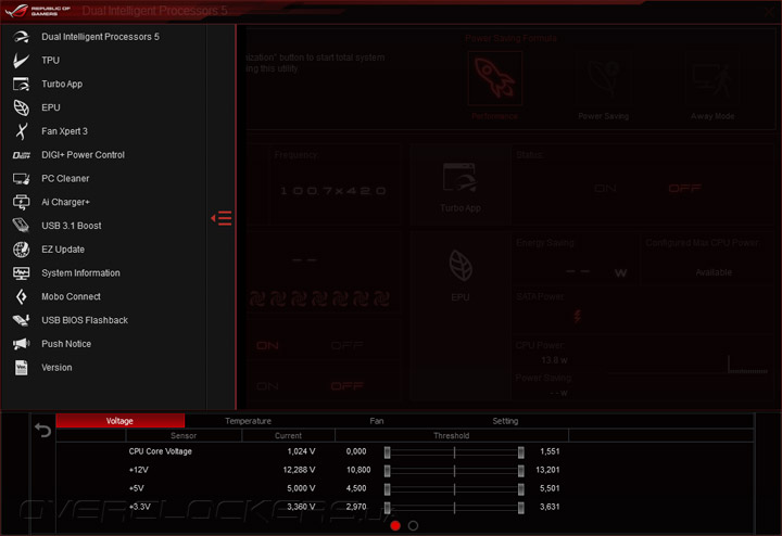 Программная составляющая комплекта поставки Maximus VIII Hero представлена всеми необходимыми драйверами и набором разнообразного фирменного ПО, которое существенно расширяет функциональность материнской платы. Центральное место занимает приложение Ai Suite 3, предназначенное для разгона, управления системой охлаждения, аппаратного мониторинга и много другого. В состав программы входят отдельные функциональные модули, объединенные общим интерфейсом. В нижней части окна всегда доступна информационная панель, на которую выводятся показания аппаратного мониторинга, выбрав «мышью» группу датчиков можно увидеть динамику изменения отдельных параметров. Кроме того, есть возможность настроить пороговые значения, по достижению которых сработает оповещение.