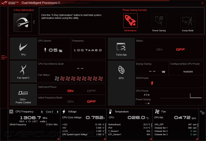 Интерфейс программного модуля Dual Intelligent Processor 5 выполнен в виде панели приборов, на которой отображаются статусы отдельных утилит.