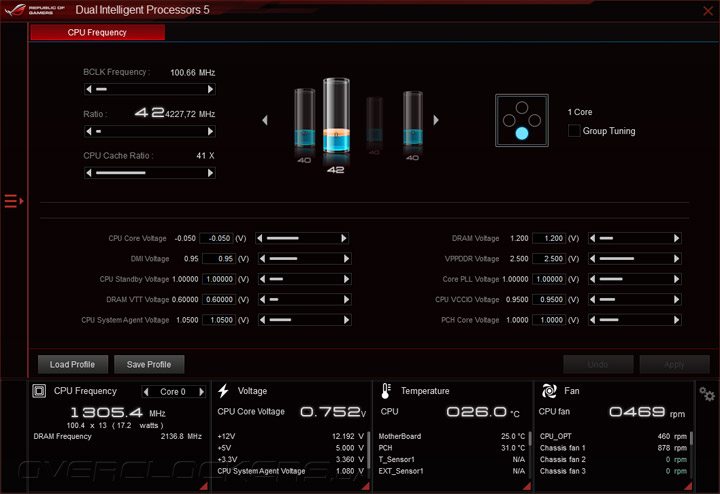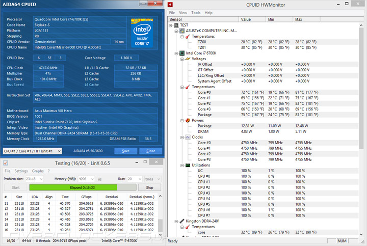 С учетом того факта, что ASUS Maximus VIII Hero оснащена мощной силовой подсистемой и продвинутым UEFI Setup, отличные результат разгона нашего тестового Skylake не стали неожиданности. Новинка с легкостью обеспечила повышение частоты Intel Core i7-6700K до 4747 МГц путем повышения коэффициента умножения до 47 единиц с одновременным увеличением BCLK до 101 МГц. Тем временим кэш 3-го уровня работал в режиме 4545 МГц, а для обеспечения стабильность параметр CPU Core/Сache Voltage был увеличен до 1,35 В, что при установке функции CPU Load-line Calibration в значение Level 5 дало итоговое напряжение 1,36 В. С такими настройками система безошибочно проходила стресс-тест LinX 0.6.5, а температуры вычислительных ядер были далеки от опасного порога даже при использовании воздушного кулера.