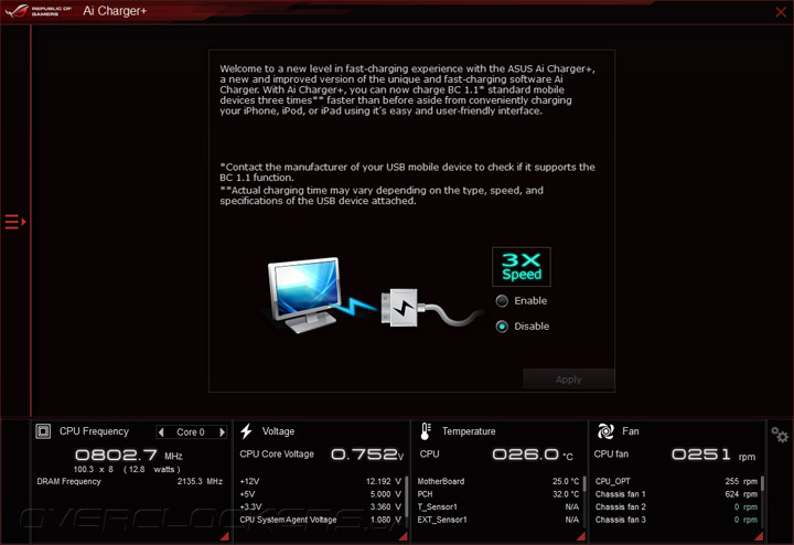 Пользователи, заряжающие свои гаджеты от портов USB, оценят наличие функции Ai Charger+, а для ускорения работы внешний накопителей можно воспользоваться приложением USB 3.1 Boost, которое активирует режим UASP (USB Attached SCSI Protocol).