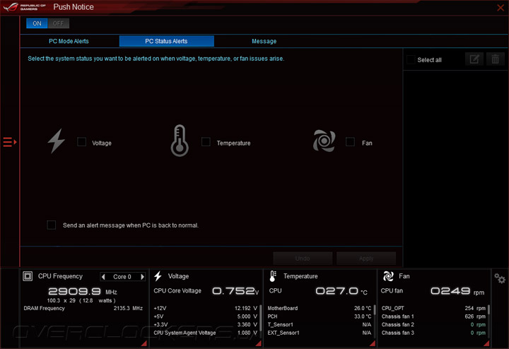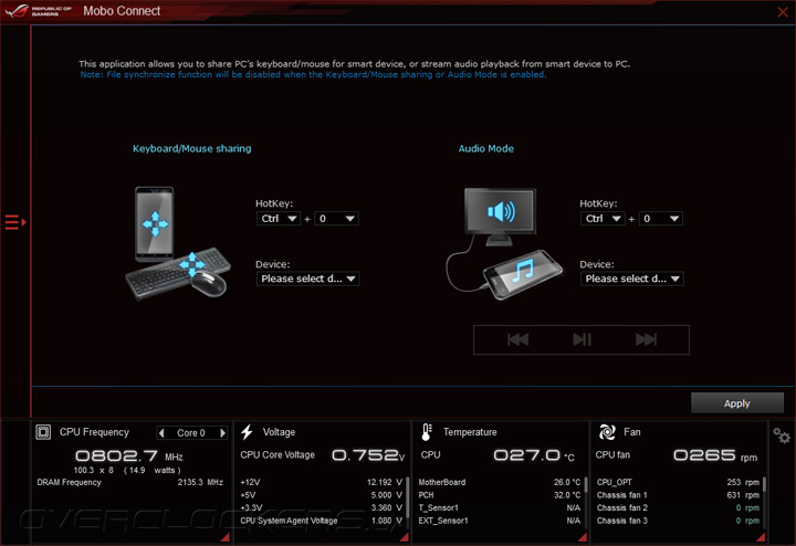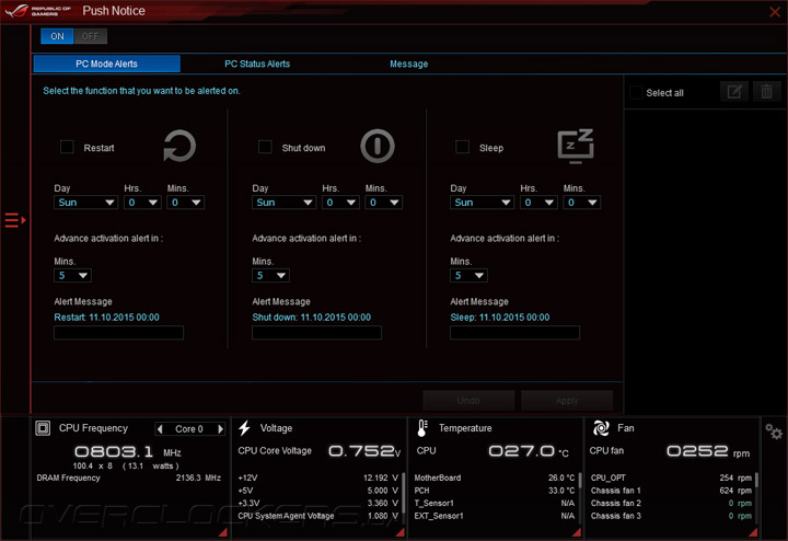 Среди возможностей программного продукта Ai Suite 3 следует отметить функцию Mobo Connect, позволяющую использовать клавиатуру и мышь, подключенные к ПК, на мобильном устройстве и транслировать звуковой поток с гаджета. Также можно отметить программный модуль Push Notice, предназначенный для задания расписания для отключения или перегрузки системного блока и отправки уведомлений при достижении критически показаний датчиков системного мониторинга.