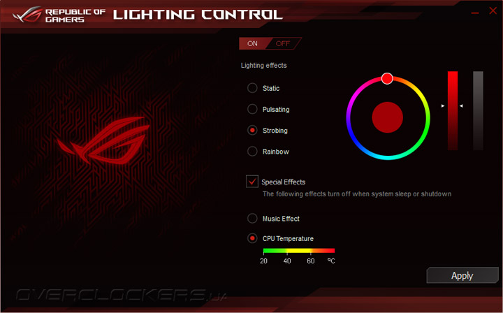 Приложение Lighting Control служит для настройки режима работы светодиодной подсветки чипсетного радиатора, причем, пользователи могут выбрать цвет и интенсивность свечения, а также задать различные спецэффекты, в том числе изменение цвета логотипа ROG в зависимости от температуры центрального процессора.