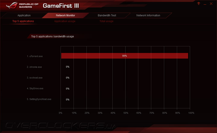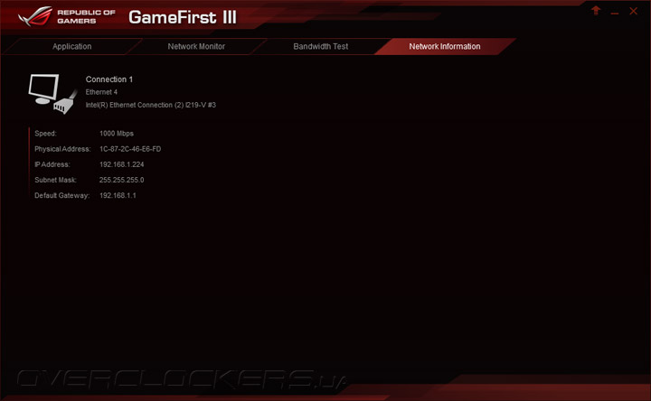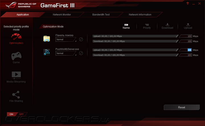 За управление полосой пропускания сетевого подключения отвечает утилита GameFirst III. Приложение позволяет выбрать один из четырех предустановленных профилей, параметры которых можно отредактировать, содержит монитор потребляемого трафика, дает возможность ограничить скорость соединения с Интернет, а также просмотреть текущие параметры сетевого подключения.