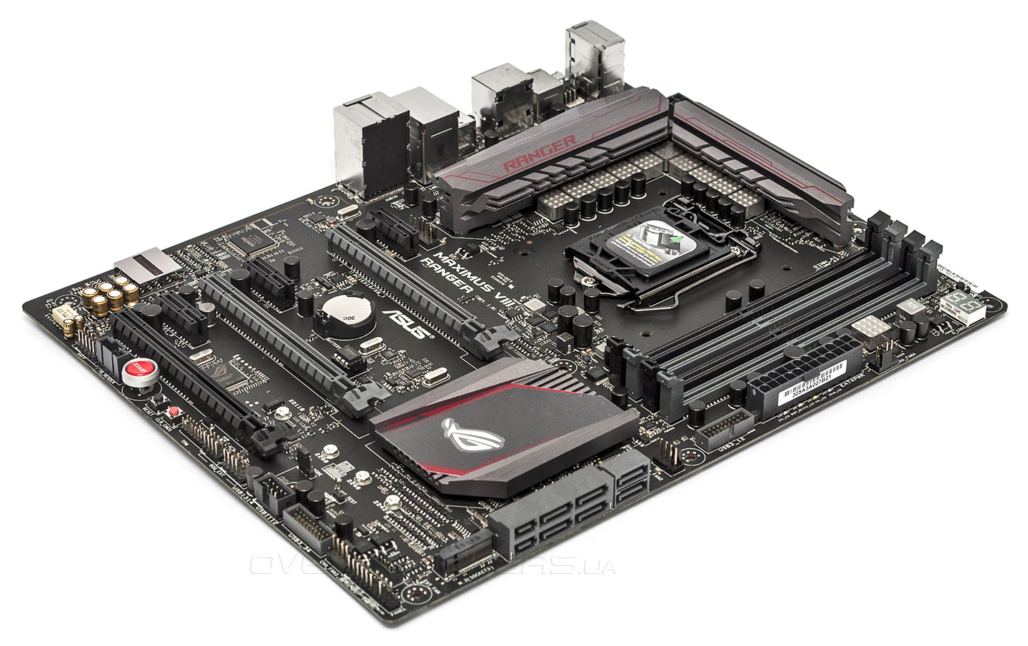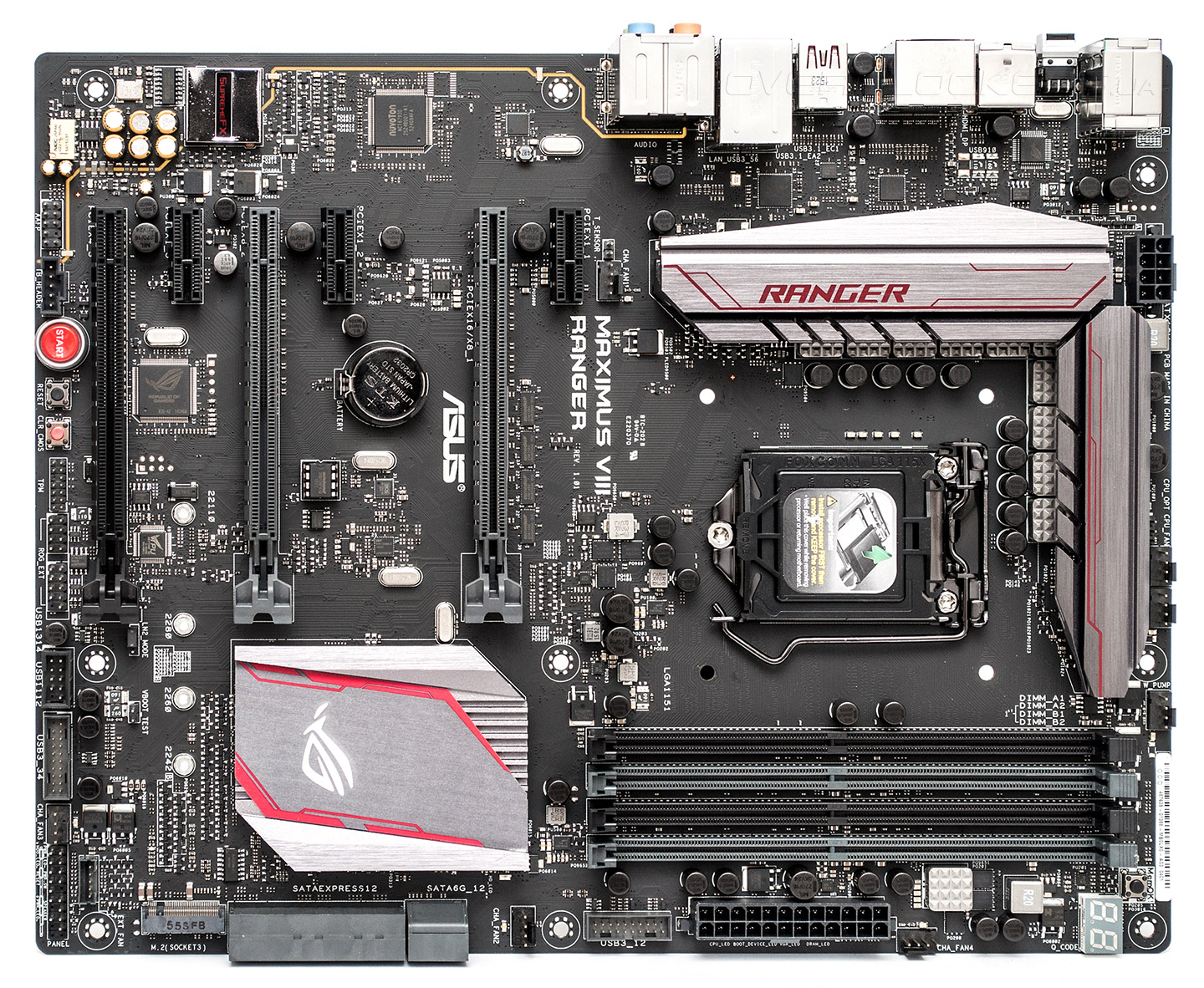 Системная плата по размерам в точности соответствуют стандарту АТХ, а все ее основные компоненты находятся на привычных местах. В палитре ASUS Maximus VIII Ranger на смену ярко-красным разъемам, которые были фирменной чертой «материнок» серии ROG предыдущих поколений, пришли слоты темно-серого и черного цветов. Новинка базируется на чипсете Intel Z170 и предназначена для эксплуатации процессоров Skylake в конструктивном исполнении LGA1151. Для установки модулей ОЗУ стандарта DDR4 служат четыре разъема DIMM. Максимальный объем оперативной памяти может достигать 64 ГБ, а в режиме разгона поддерживаются частоты до 3400 МГц включительно.