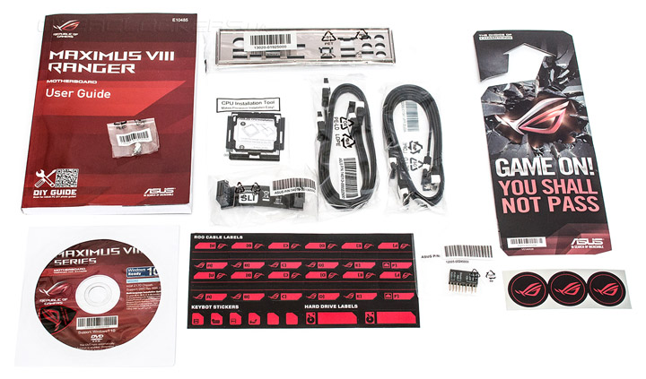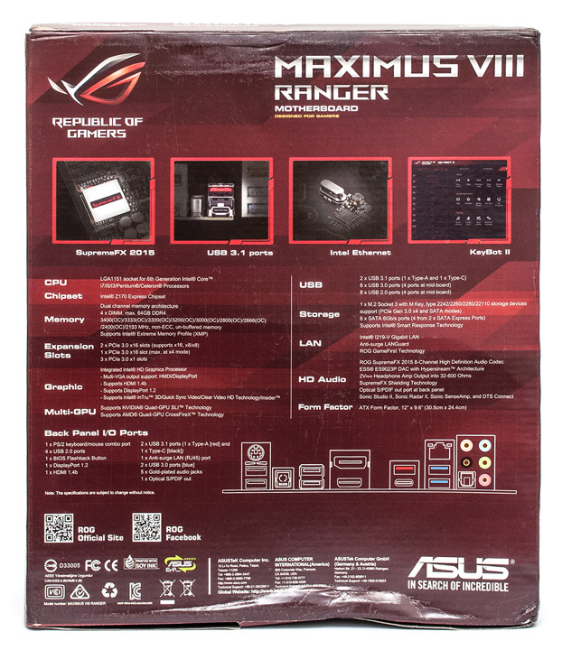 На тыльной поверхности упаковки нашлось место для краткой спецификации материнской платы и схематического изображения разъемов задней панели, а также сведений о ключевых особенностях Maximus VIII Ranger, таких как наличие продвинутой звуковой подсистемы SupremeFX 2015, поддержка высокоскоростного интерфейса USB 3.1 и фирменной технологии Keybot II, предназначенной для расширения функциональности клавиатуры.