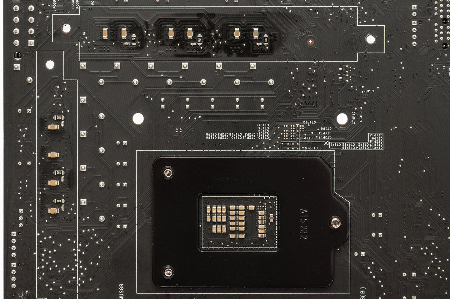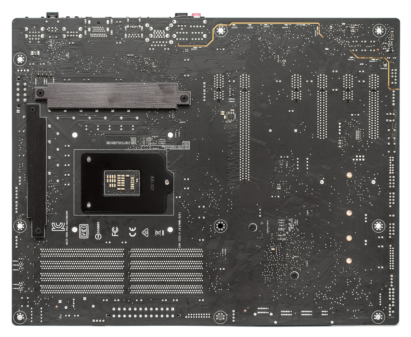 Компоненты с обратной стороны печатной платы практически отсутствуют за исключением области позади процессорного разъема, где находится пара металлических пластин, которые являются частью системы охлаждения узла электропитания. Впрочем, они не должны помешать установке кулеров с крупными усилительными пластинами.