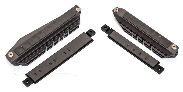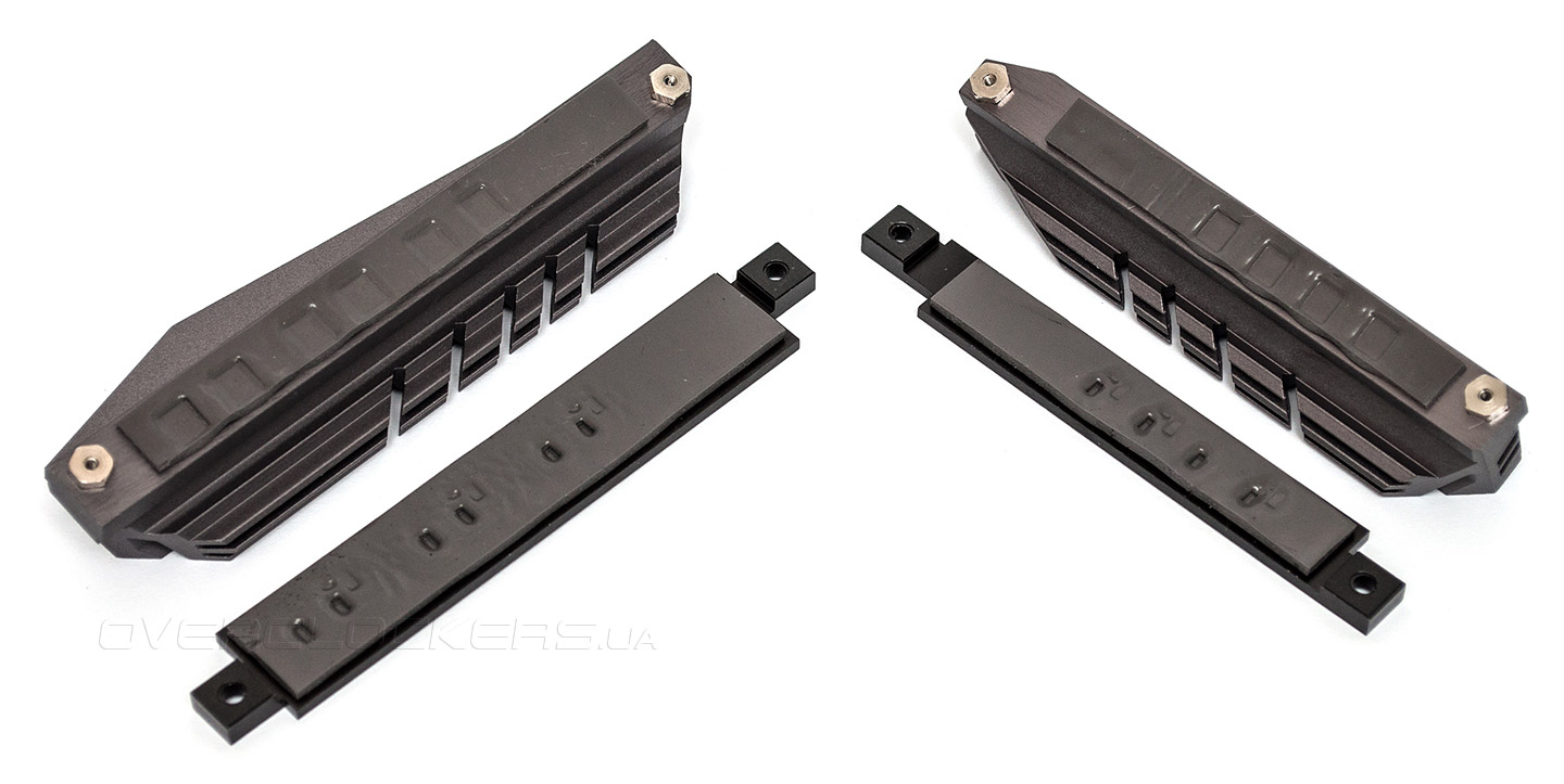 На подошвах охладителей находятся прокладки из эластичного термоинтерфейса, винтовое крепление обеспечивает надежную фиксацию радиаторов, а металлические пластины с обратной стороны РСВ не столько участвуют охлаждении преобразователя напряжения, но помогают предотвратить деформацию текстолита.