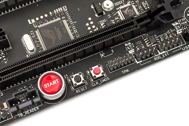Материнская плата оснащена семью разъемами для подключения вентиляторов с поддержкой ШИМ-управления скоростью вращения, а также парой контактов, к которым подсоединяется внешний температурный датчик. Еще три «карлсона» и столько же термсенсоров можно подключить к дополнительной плате Fan Extension Card, для работы с которой у Maximus VIII Ranger имеется специальный порт EXT_FAN, правда, саму плату придется приобретать отдельно. Любители разгона в условиях отрытого стенда оценят наличие у новинки кнопок включения, перегрузки и сброса настроек UEFI, рядом с которыми находится разъем ROG_EXT, предназначенный для подключения внешнего модуля управления и мониторинга OC Panel, знакомого по обзорам старших «материнок» ASUS семейства Republic of Gamers.