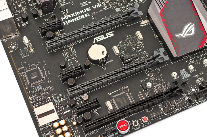 Для установки графических ускорителей материнская плата предлагает пару слотов PCI Express 3.0 x16, которые могут работать в режимах «х16+х0» или «х8+х8», позволяющие строить на базе Maximus VIII Ranger системы AMD CrossFireX и NVIDIA SLI. Третий разъем PCI Express 3.0 x16 подключен к чипсету, он всегда работает в режиме x16@x4, что, впрочем, не мешает использовать его для установки третьей видеокарты AMD в связке CrossFireX. Для установки плат расширения служат три порта PCI-E 3.0 x1, причем, два из них гарантированно будут доступны даже в случае использования графических ускорителей с массивными системами охлаждения.