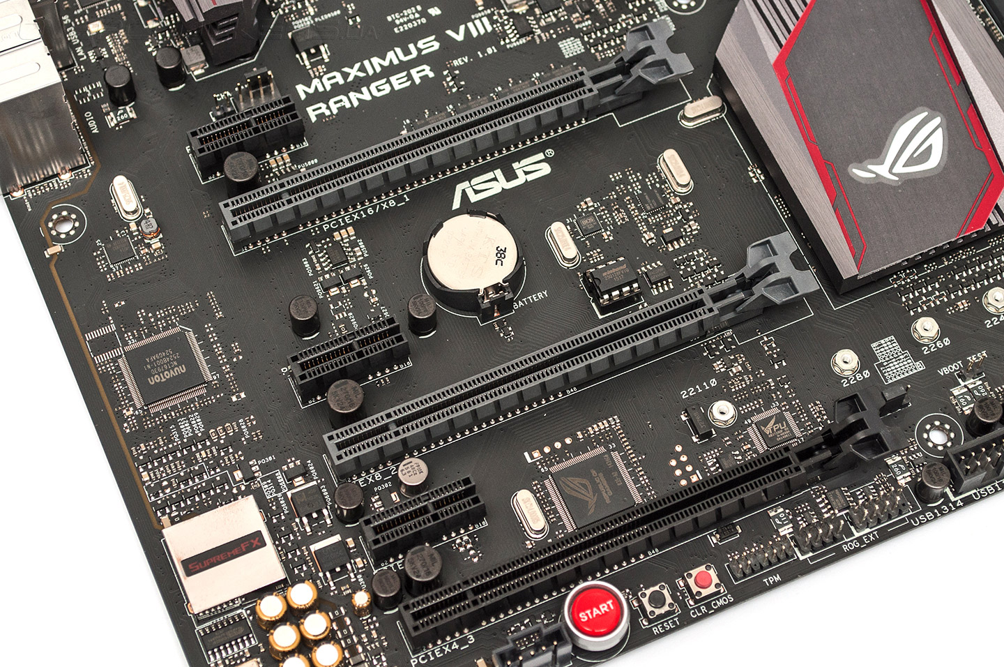Силовая подсистема ASUS Maximus VIII Ranger получает электропитание от восьмиконтактного разъема. Процессорный VRM насчитывает десять фаз, из которых восемь каналов формируют напряжение для вычислительных ядер и кэша L3, а две оставшихся отвечают за питание встроенного в процессор северного моста. В качестве силовых элементов используются десять интегральных сборок TI CSD87350, за управление VRM отвечает цифровой ШИМ-контроллер DIGI+ EPU ASP1400B.